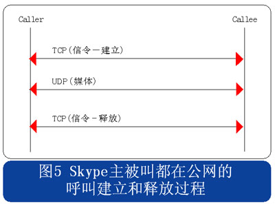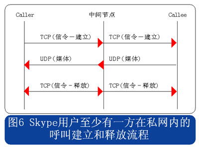 從上述流程圖可見,Skype的呼叫信令都采用TCP封裝,而媒體流則使用UDP封裝,當(dāng)有任何一方用戶位于限制UDP包的防火墻內(nèi)時,媒體流就會采用TCP封裝。另外當(dāng)Skype用戶至少有一方位于私網(wǎng)內(nèi)時,所有的信令和媒體消息都經(jīng)過一個或多個中間節(jié)點轉(zhuǎn)發(fā)。此時無需擔(dān)心用戶通話的媒體流因為經(jīng)過中間節(jié)點轉(zhuǎn)發(fā)而被竊聽,因為Skype采用了對消息進行端到端加密的機制。