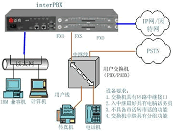 根據(jù)電話交換機(jī)的配置和功能不同,電話交換機(jī)與 interPBX設(shè)備的連接方式有二種常見(jiàn)方式,下面結(jié)合示意圖來(lái)具體說(shuō)明。