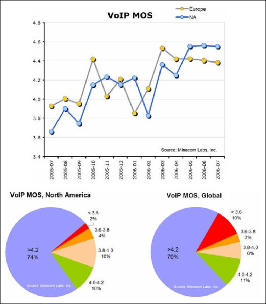 Minacom最新調研表明,一年來VoIP電話質量和聯結速度都超過傳統(tǒng)標準公共開關電話。電話質量得分Mean Opinion Score (MOS)數據表明,VoIP得分是4.2,而標準公共開關電話得分3.9。85%的IP電話質量和穩(wěn)定性都超過標準公共開關電話。對電話聯結速度,VoIP的MOS得分是平均8.2秒,傳統(tǒng)電話時間更長,平均為8.9秒。這里的IP電話服務指商業(yè)企業(yè)級應用,不是MSN,雅虎通之類免費IP電話個人應用。比較而言,北美IP電話質量優(yōu)于歐洲。