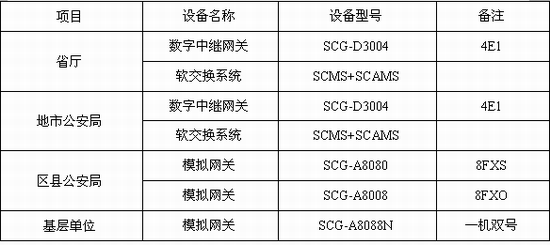 在區(qū)縣局,可采用數(shù)字E1中繼網(wǎng)關(guān)SCG-D3004或采用模擬語音網(wǎng)關(guān)(SCG-A8000);當(dāng)話務(wù)量不是很高時(shí),可采用模擬語音網(wǎng)關(guān)與用戶原有的