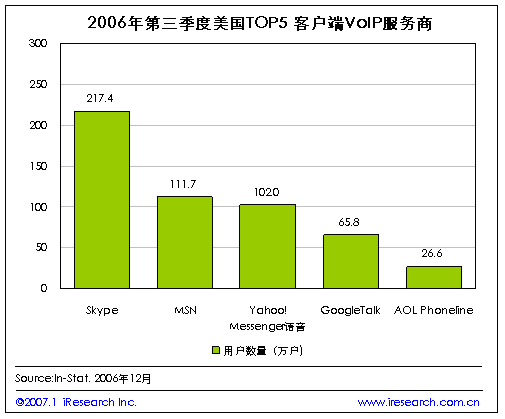 iResearch艾瑞市場咨詢根據(jù)In-Stat的統(tǒng)計數(shù)字整理發(fā)現(xiàn),目前在美國VoIP市場中,以客戶端為服務(wù)基礎(chǔ)的服務(wù)提供商的用戶數(shù)量來看,占市場主導(dǎo)位置的五大服務(wù)商為Skype、MSN、Yahoo、Google和AOL.到2006年第三季度為止,Skype的用戶已經(jīng)達到了217.4萬,排名第五位AOL Phoneline的用戶數(shù)量也有26.6萬之多。艾瑞市場咨詢