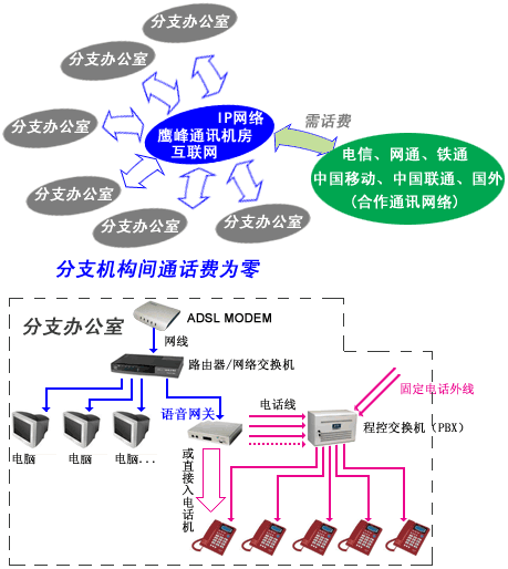 針對以上現(xiàn)狀,鷹峰NGN組網(wǎng)方案協(xié)助A公司在中國總部進(jìn)行了周密的分析與考察并就相關(guān)的產(chǎn)品技術(shù)進(jìn)行了深入的研究與探討,提供了以A公司在中國現(xiàn)有數(shù)據(jù)專網(wǎng)為基礎(chǔ)的,融合語音通信的解決方案,這是一套充分利用A公司現(xiàn)有數(shù)據(jù)網(wǎng)絡(luò)資源優(yōu)勢,可行、先進(jìn)、完整的企業(yè)VoIP通信解決方案。將最終以A公司目前在中國所有機(jī)構(gòu)為結(jié)點(diǎn),組成在中國的VoIP網(wǎng)絡(luò)。方案匯集了鷹峰通訊所有最新PBX/語音網(wǎng)關(guān)及網(wǎng)絡(luò)通訊技術(shù)及設(shè)備,保護(hù)了原有的交換機(jī)資源,不改變撥號(hào)習(xí)慣,體現(xiàn)了非?捎^的經(jīng)濟(jì)效益,并且實(shí)現(xiàn)了快速實(shí)施,將投入的時(shí)間,資金縮到了最小。