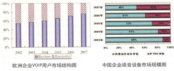 相關數據顯示,企業(yè)級VOIP的市場規(guī)模將以超過40%的年復合增長率增長,2010年前仍將占據整個VOIP市場的50%以上。從“歐洲VOIP用戶市場結構圖”來看,企業(yè)VOIP用戶的占比在逐年提升,2007年可達到70%左右。全球企業(yè)VOIP的設備銷售形勢也是一片大好,Juniper Research最新發(fā)表的研究報告稱,2007年企業(yè)VOIP設備市場的銷售收入將達到55億美元。