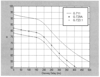 Datagram Protocol)協(xié)議進(jìn)行傳輸[1]。近年來,隨著IP網(wǎng)絡(luò)技術(shù)的廣泛應(yīng)用,VoIP成為一種新興的電話通信方式,IP網(wǎng)絡(luò)所提供的語音質(zhì)量問題受到人們的普遍關(guān)注,如何對語音質(zhì)量進(jìn)行科學(xué)可靠的測量和評價是網(wǎng)絡(luò)測量和網(wǎng)絡(luò)規(guī)劃設(shè)計中十分關(guān)鍵的問題。E-Model作為語音質(zhì)量測量的一種新方法,它適合數(shù)據(jù)網(wǎng)絡(luò)的語音質(zhì)量測量,必將有廣泛的應(yīng)用。本文將在E模型下分析延時、噪聲、回音和語音壓縮等對VoIP語音質(zhì)量的影響。