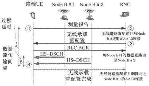 對于下面的延時分析,我們假設(shè)信令無線承載(SRB)在下行映射到HS-DSCH信道上,在上行映射到增強上行鏈路專用信道(E-DCH)上,且TTI均為10ms。HS-DSCH是HSDPA的傳輸信道,E-DCH是HSUPA的傳輸信道。首先,當(dāng)滿足測量觸發(fā)事件1d(最優(yōu)小區(qū)改變)時,UE在信令無線承載上發(fā)送測量報告。傳輸從t1開始,RNC在t2時刻接收到消息。服務(wù)RNC將為目標NodeB保留基站資源和Iub資源。該資源的預(yù)留通過使用預(yù)配置可以完成得非?臁R坏┵Y源在t3時刻準備好,RNC將向UE發(fā)送無線承載重配置消息,此時UE還是從源NodeB中接收數(shù)據(jù)。當(dāng)UE對重配置消息進行解碼,并且在有效時刻t4到期前,UE接收數(shù)據(jù)將從源小區(qū)切換到目標小區(qū)。UE開始監(jiān)聽目標小區(qū)的高速共享控制信道(HS-SCCH),HS-SCCH是HSDPA下行的共享控制信道。UE也會測量目標小區(qū)的信道質(zhì)量,并發(fā)送目標小區(qū)的CQI報告。源小區(qū)該用戶的MAC-hs在小區(qū)切換后將重置,并將緩存的協(xié)議數(shù)據(jù)單元(PDU)刪除。同時目標小區(qū)MAC-hs中的流控單元開始從服務(wù)RNC中請求PDU,這樣便可以通過HS-DSCH向用戶發(fā)送數(shù)據(jù)。在小區(qū)切換過程中,RNC可以同時向兩個Node