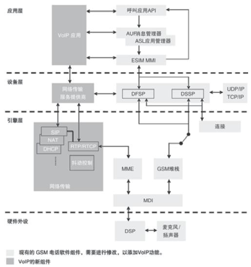 藍(lán)色方塊表示現(xiàn)有平臺的新應(yīng)用,包括網(wǎng)絡(luò)傳輸協(xié)議、核心控制VoIP應(yīng)用。由于支持GPRS功能的每部移動(dòng)電話都應(yīng)該帶有TCP/UDP