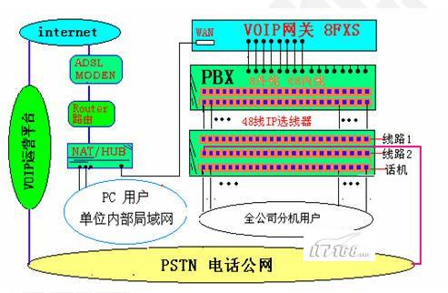 如果現(xiàn)有網(wǎng)絡(luò)接入方式為ADSL寬帶撥號(hào)上網(wǎng),全公司共享上網(wǎng)使用,如果想要支持超過(guò)4人以上同時(shí)通話,為了使數(shù)據(jù)和語(yǔ)音互相不爭(zhēng)用帶寬,必須考慮另外申請(qǐng)一條ADSL。下圖為PBX、VOIP、選路器接線圖: