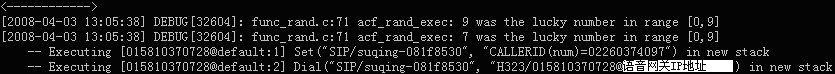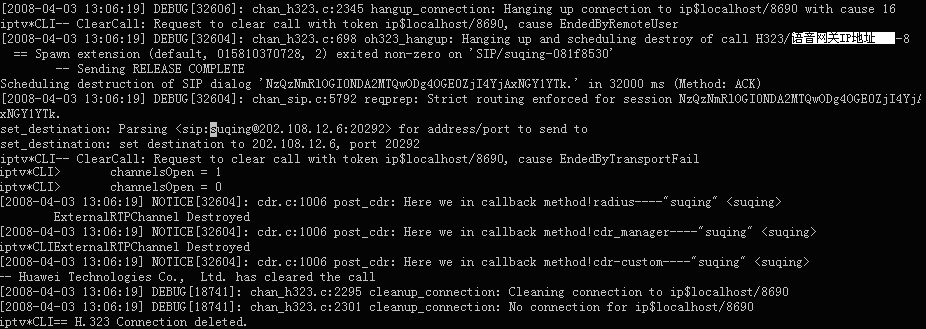 表示軟交換Asterisk與華為8010語音網(wǎng)關(guān)的H323連接在此釋放