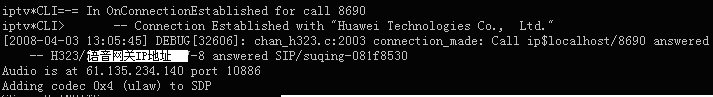 表示軟交換Asterisk與華為8010語音網(wǎng)關(guān)的H323連接已經(jīng)成功建立