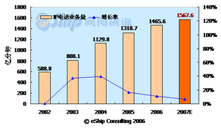 從圖中可以看出,國(guó)內(nèi)IP電話市場(chǎng)近年呈現(xiàn)出快速增長(zhǎng)趨勢(shì),2002-2007年年均增長(zhǎng)率為20.7%。預(yù)計(jì)2007年IP電話的通話時(shí)長(zhǎng)將達(dá)到1567.6億分鐘,同比增長(zhǎng)7%。但從2005年開始,IP電話的增長(zhǎng)率呈下降趨勢(shì),這主要是受管制限制和移動(dòng)長(zhǎng)途的替代作用所致。