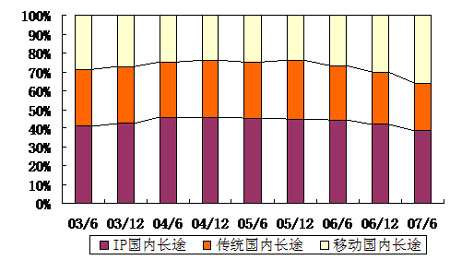 從圖中可以看出,IP電話的相對(duì)快速增長(zhǎng)在一定程度上對(duì)傳統(tǒng)長(zhǎng)途電話形成了替代作用,但近年來自于移動(dòng)長(zhǎng)途的替代作用更明顯。從占比上來看,2007年上半年,IP國(guó)內(nèi)長(zhǎng)途電話占全部國(guó)內(nèi)長(zhǎng)途通話量38.3%,超過移動(dòng)長(zhǎng)途電話的35.9%和傳統(tǒng)長(zhǎng)途電話的25.8%,仍然是長(zhǎng)途電話的主流。