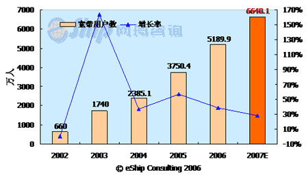 從圖中可以看出,中國(guó)的寬帶用戶數(shù)保持了快速的發(fā)展勢(shì)頭,從2002-2007年年均增長(zhǎng)率為58.7%,至2007年,國(guó)內(nèi)的寬帶用戶數(shù)將達(dá)到6640.1萬。