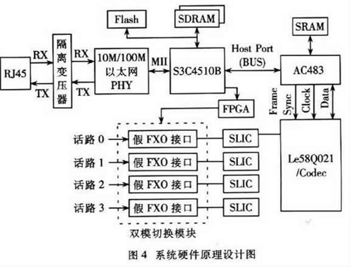 本節(jié)提出了一種基于H.323的雙模網(wǎng)關的系統(tǒng)設計方案,該方案支持4路話音,使用一種經濟實用的“假FXO接口”方式實現(xiàn)雙模切換,能夠在VoIP通話時檢測到PSTN線上進來的呼叫并可通過按話機的拍簧或者Flash閃斷鍵切換接聽!