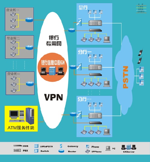 3、如上圖所示,已加裝了PBX的總行或分行,在以前的PBX上加裝GW,使得PBX通過(guò)GW進(jìn)入銀行的數(shù)據(jù)專網(wǎng)并注冊(cè)到GK,GK給其分配內(nèi)網(wǎng)的號(hào)碼,這樣在不淘汰原有設(shè)備的情況下,有PBX的依然可以與網(wǎng)內(nèi)的其他終端進(jìn)行零話費(fèi)通話。