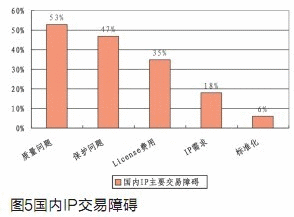 根據(jù)我們對(duì)92家芯片設(shè)計(jì)企業(yè)的問(wèn)卷調(diào)查,IP質(zhì)量、IP保護(hù)和IP費(fèi)用是目前國(guó)內(nèi)IP核交易中的主要障礙。(見圖5)