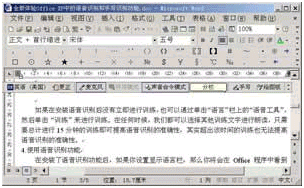 在安裝了語音識別功能后,如果你設(shè)置顯示語言欄,那么你將會在Office程序中看到如圖14所示的麥克風(fēng)圖標(biāo)(如果未看到,請從"工具"菜單中選中"語音"項),工作時將在"聽寫"和"聲音命令"模式之間進行切換。