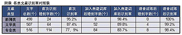然后,我們又利用聲龍?zhí)赜械脑~匯生成器,讓聲龍自行辨別文章中的詞匯并自動添加到自建詞庫中,并針對其中的一些英文單詞或縮寫對聲龍進行語音識別訓(xùn)練,之后我們再次錄入同一篇專業(yè)文章。結(jié)果非常令人滿意,從附表可以看出識別率有了明顯提高。最后,我們又錄入了另一篇相同領(lǐng)域的專業(yè)文章中的一段(512字)。首次錄入的錯別字有46個,識別正確率為91%。與第一篇文章相比,識別率有了明顯提高。