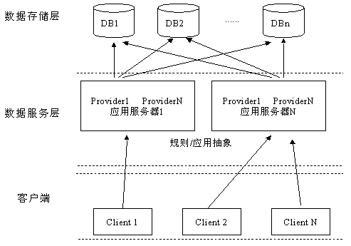 各種業(yè)務均有邏輯上獨立的應用服務器,每個應用服務器從性能和安全的角度考慮,可能含有兩個以上獨立的物理點,而每個物理點上又可能含有兩個以上的邏輯服務提供點(Provider),這意味著在應用服務器中存在這樣一個判斷規(guī)則(或服務),當發(fā)現一個邏輯點存在性能或安全障礙時,系統動態(tài)創(chuàng)建另一個邏輯服務提供點。每一個邏輯服務提供點(Provider)可能與數據庫只有一個連接,即多個用戶在數據庫服務器端只有一個Session,從而大大節(jié)約系統開支。系統結構如下圖所示: