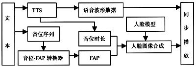 FAP一共有68個參數(shù),包括兩個高級參數(shù)和66個低級參數(shù)。高級參數(shù)是視位(viseme)和表情(expression),視位分為15個,分別表示人們發(fā)某一音位時的面部動作;表情分為高興、悲傷、憤怒、害怕、厭惡、驚奇六種。66個低級參數(shù)用來控制部分FDP特征點的運動,進而形成各種復(fù)雜的人臉動作。這些標(biāo)準(zhǔn)的制定極大地推動了參數(shù)控制合成方法的發(fā)展,使這種方法在人機交互、計算機網(wǎng)絡(luò)交談、游戲動畫等方面得到更為廣泛的應(yīng)用,圖2 是參數(shù)控制的TTVS系統(tǒng)的基本框架。