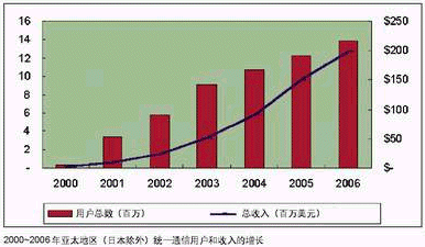 據(jù)IDC預(yù)測,亞太地區(qū)(不包括日本)統(tǒng)一通信用戶數(shù)量將從2000年的32萬增長到2006年的1385萬。盡管起點(diǎn)較低,收入將從2000年的119萬美元增長到2006年的1.987億美元。這個(gè)增長大部分受中國和澳大利亞推動(dòng),在這兩個(gè)國家,價(jià)格和市場由上層大電信公司決定。