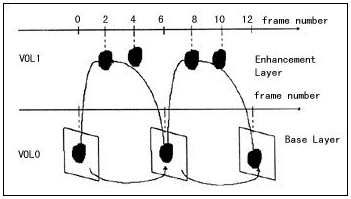 時域可擴展性編碼通常是通過在碼流中添加B幀來實現(xiàn)的。B幀是使用與它在時間上最近鄰的前后兩個I幀或P幀來預(yù)測的,而自己并不作為任何其它幀的參考圖像,因此在傳輸中丟棄B幀并不影響其它幀的質(zhì)量,而僅僅降低幀率。圖1是MPEG-4的時域可擴展性編碼的示意圖。