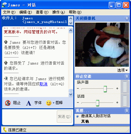 單擊對(duì)話(huà)框右邊的“啟動(dòng)攝像機(jī)”和“開(kāi)始交談”,系統(tǒng)會(huì)提示你正在等待對(duì)方回應(yīng)視頻或語(yǔ)音對(duì)話(huà)的邀請(qǐng),對(duì)方接受,就開(kāi)始進(jìn)行視頻通話(huà)(見(jiàn)圖11)。如果雙方都有攝像頭,你還可以通過(guò)視頻框下面的“選項(xiàng)”將自己的影像設(shè)為畫(huà)中畫(huà)的功能。
