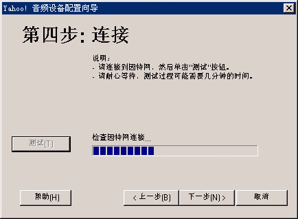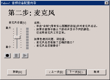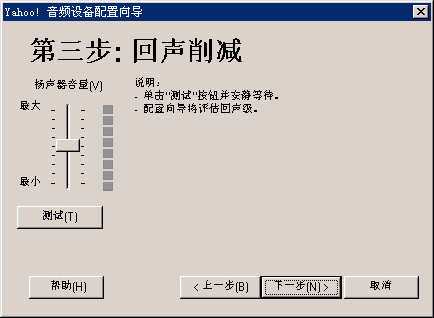 選擇幫助->音頻設(shè)備配置向?qū)?圖2),會(huì)彈出“音頻設(shè)備配置向?qū)А贝翱?圖3),這個(gè)向?qū)?huì)幫助你對(duì)揚(yáng)聲器、麥克風(fēng)、回音、網(wǎng)絡(luò)連接等項(xiàng)目進(jìn)行標(biāo)準(zhǔn)的測(cè)試和設(shè)置。