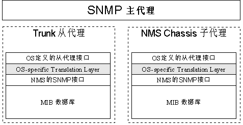 SNMP采用了Client/Server模型的特殊形式:代理/管理站模型。對網(wǎng)絡(luò)的管理與維護是通過管理工作站與SNMP代理間的交互工作完成的。每個SNMP從代理負責(zé)回答SNMP管理工作站(主代理)關(guān)于MIB定義信息的各種查詢。下圖10是NMS公司網(wǎng)絡(luò)產(chǎn)品中SNMP協(xié)議的實現(xiàn)模型。