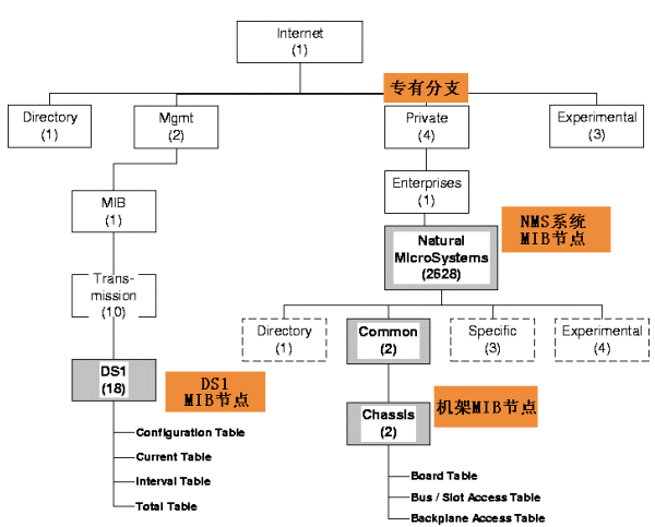 下圖給出了NMS系統(tǒng)中SNMP可訪問網(wǎng)絡(luò)設(shè)備的對象識別樹(OID:Object Identifier)結(jié)構(gòu)。