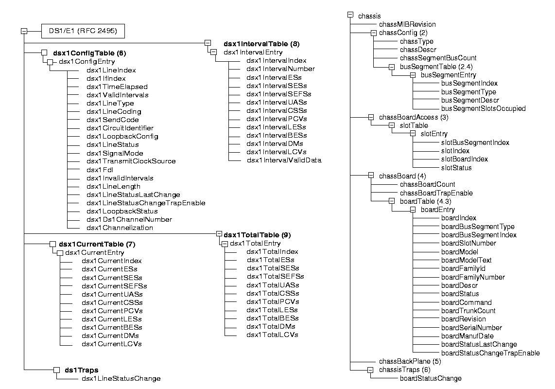 圖14中左圖給出了RFC2495對DS1/E1中繼線的MIB信息樹圖,右圖是NMS系統(tǒng)中對機架Chassis管理MIB約定。