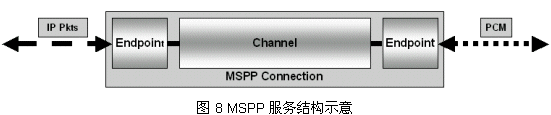 MSPP運行在FusionTM環(huán)境下,意即Media Stream Processing Protocol,媒體流處理協(xié)議,它為各種業(yè)務(wù)間的數(shù)據(jù)轉(zhuǎn)換/交互提供了一種可能。它相當(dāng)于一個中間代理(Agent),通過標(biāo)準(zhǔn)的入口/出口終結(jié)點(Entry and Exit Endpoint)和端到端連接(End-End Connection)完成異種網(wǎng)絡(luò)間的格式化數(shù)據(jù)(Formatted Data)傳遞功能,見圖8。MSPP包含兩個基本組件:終結(jié)點(Endpoint)和通道(Channel),異種網(wǎng)絡(luò)間通過這兩種組件構(gòu)成的連接(Connection)完成。