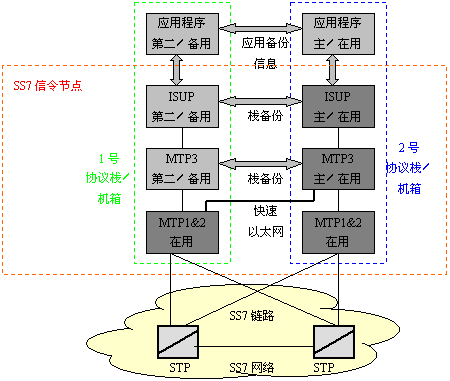 只有SS7鏈路出現(xiàn)故障時,SS7協(xié)議才有相應(yīng)的規(guī)則去處理故障,對其它故障的處理必須在設(shè)計SS7平臺和整個系統(tǒng)結(jié)構(gòu)時予以考慮。還有一個普遍的要求是:軟件的升級過程中不能影響整個系統(tǒng)的運行。能達到以上要求的一個解決方案是:使用兩個主機箱,在每個主機箱里插有SS7接口板,用于支持一條或多條SS7鏈路。讓兩個主機都使用一個SS7地址,也就是共用一個信令點編碼,這樣遠端的交換機或STP就會認為這兩個主機是一個完整的系統(tǒng)。這樣,這兩個主機組成的系統(tǒng)就能在其中一個出現(xiàn)故障時仍能正常工作。