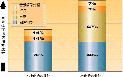 如圖4所示,是一個典型VoP系統(tǒng)大約的相對成本構(gòu)成。第一根柱圖代表無壓縮語音業(yè)務(wù),而第二根柱圖代表壓縮語音業(yè)務(wù)。這個柱形圖說明:回聲抑制和壓縮是實現(xiàn)這類網(wǎng)關(guān)的語音處理技術(shù)中成本最高的兩個功能。如果這兩種業(yè)務(wù)功能通過某一技術(shù)實現(xiàn)而能在密度和功耗方面得到一個數(shù)量級性質(zhì)的改善,那麼人人都能從中受惠。