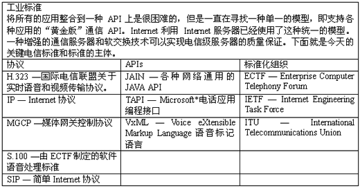 Internet一個深層次的發(fā)展是開放的Internet服務(wù)器,它給數(shù)以百萬計的PC瀏覽器提供高級應(yīng)用程序和Internet無窮內(nèi)容的接入能力。做為重新構(gòu)建話音網(wǎng)絡(luò)的一部分,開放的軟交換--提供基于軟件的交換服務(wù)--也將會具有為數(shù)以百萬計的無線和有線電話分送數(shù)據(jù)的能力。對于用戶來說,其結(jié)果就是他們將很容易的通過語音接入Internet和具有豐富的語音服務(wù)的環(huán)境。