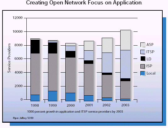關(guān)于新的業(yè)務(wù)提供商的前景,ASP是最為熱門的,由于整個行業(yè)的外購趨勢,使得它吸引了數(shù)目巨大的風(fēng)險債券和投資。但是如果說他們只是關(guān)注外購那就太籠統(tǒng)了。事實上一些公司是以托管為中心的,一些是以連通性為中心的,還有一些是以應(yīng)用為中心的。