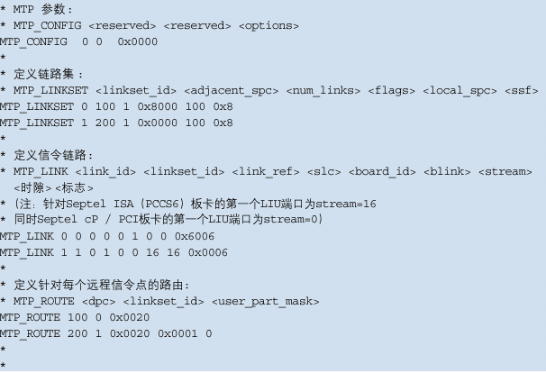 system.txt文件必須也包括主機(jī)上運(yùn)行的所有本地SS7協(xié)議,如ISUP、TUP、SCCP或TCAP(如果有),以及應(yīng)用程序任務(wù)、配置工具(如s7_mgt)和調(diào)試工具的LOCAL定義。這里也應(yīng)該通過(guò)FORK_PROCESS語(yǔ)句來(lái)啟動(dòng)相應(yīng)的驅(qū)動(dòng)和支持任務(wù),在相應(yīng)的程序員手冊(cè)中有詳細(xì)描述。
