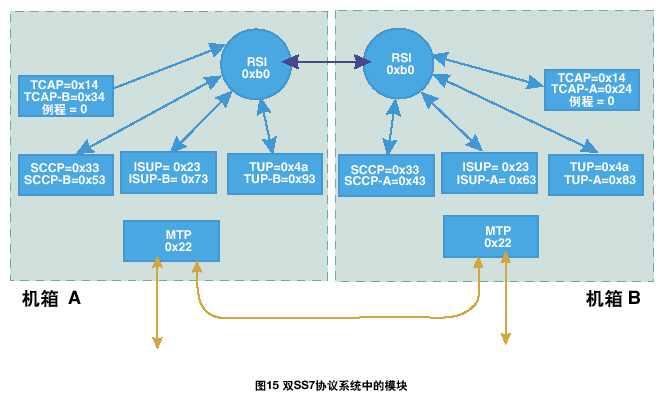 下圖展示了一個(gè)雙ISUP/TUP/SCCP/TCAP系統(tǒng)中各模塊之間的關(guān)系,以及系統(tǒng)兩部分的config.txt文件中的相應(yīng)條目。參見(jiàn)圖15。
