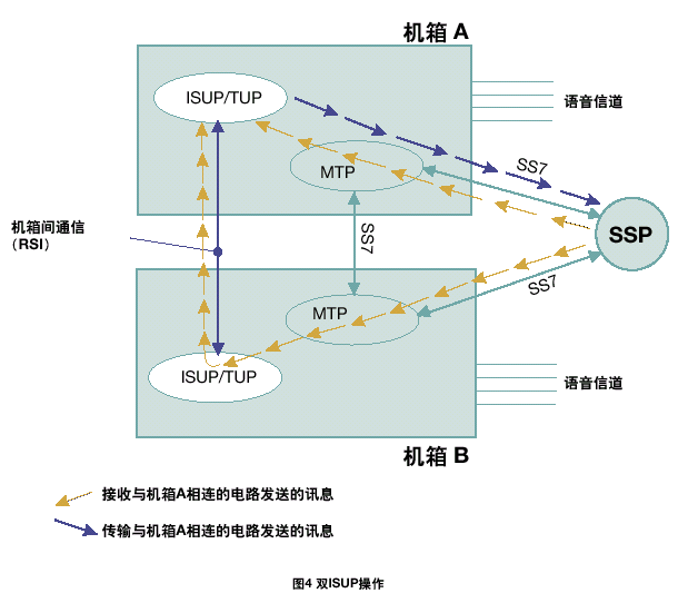 一個(gè)雙ISUP/TUP系統(tǒng)通過(guò)激活每個(gè)機(jī)箱中的一半電路協(xié)議狀態(tài)機(jī)進(jìn)行工作。每個(gè)ISUP/TUP層通過(guò)本地MTP3發(fā)送所有的傳送流量。本地MTP3采用與相鄰S(chǎng)S7節(jié)點(diǎn)之間的本地鏈路進(jìn)行傳輸,如果該鏈路發(fā)生故障,則采用機(jī)箱之間的SS7鏈路。