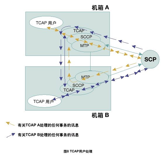 TCAP用戶(hù),如GSM-MAP、IS41和INAP等,與它們使用的TCAP層緊密地結(jié)合。在一個(gè)多TCAP系統(tǒng)中,TCAP用戶(hù)之間共享事務(wù),在雙TCAP系統(tǒng)中平均分配。在TCAP層完成了接受到的訊息針對(duì)相應(yīng)TCAP狀態(tài)機(jī)的處理;因此,在TCAP用戶(hù)層不需要額外的處理。參見(jiàn)圖8。