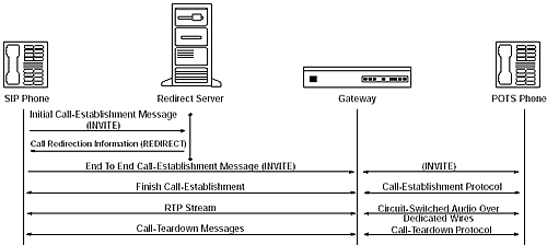 圖5里的重定向服務(wù)器,只處理發(fā)給被叫方的第一個(gè)INVITE消息,并反饋一個(gè)特殊的回應(yīng)給主叫方。主叫方從回應(yīng)中取出一個(gè)新的地址,并給這個(gè)地址發(fā)送INVITE消息。這個(gè)地址可能是真實(shí)的被叫方,代理服務(wù)器或者另一個(gè)重定向服務(wù)器。從這以后,所有消息都直接在主叫方和新的地址之間傳遞。