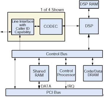 一個(gè)板卡上的微處理器控制D/4PCIU和D/4PCIUF通過一個(gè)本地總線控制板卡所有操作,它從主機(jī)截獲和執(zhí)行命令。這個(gè)微處理器處理實(shí)時(shí)的事件,管理和主機(jī)交互的數(shù)據(jù)流,提高系統(tǒng)的反應(yīng)時(shí)間,減少主機(jī)處理的需求,傳遞給應(yīng)用程序之前處理DTMF和電話信令,把DSP解脫出來專門做信令處理。這個(gè)微處理器和主機(jī)的通信是通過一個(gè)共享RAM,它作為一個(gè)輸入/輸出緩沖區(qū)增加的磁盤文件傳輸?shù)男省_@個(gè)RAM和主機(jī)的接口是PCI總線。為了滿足實(shí)時(shí)系統(tǒng)的要求,所有操作的是中斷驅(qū)動(dòng)的。所有安裝在PC里面的D/4PCIUF板卡共享同一個(gè)中斷。在系統(tǒng)初始化的時(shí)候,固件從主機(jī)下載到板卡上的代碼/數(shù)據(jù)
