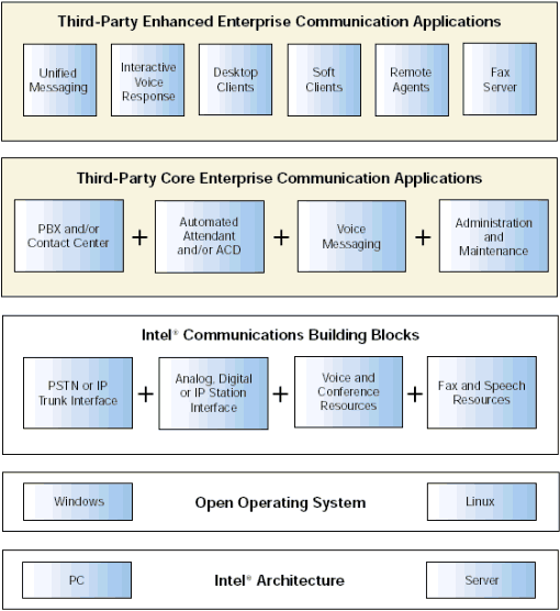 - 第3層:PSTN或IP中繼線接口的Dialogic通信構(gòu)建模塊;模擬、數(shù)字或IP站接口;以及語音、會(huì)議、傳真和話音(speech)資源。