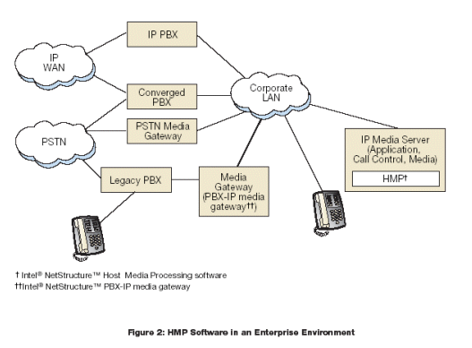 圖2表示使用HMP軟件的IP媒體服務(wù)器,部署在企業(yè)環(huán)境的例子,包括IVR,自動應答,語音郵箱,統(tǒng)一消息,語音識別和會議服務(wù)。