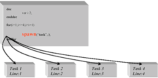 VOS內(nèi)部同時(shí)運(yùn)行4個(gè)任務(wù)。開(kāi)始只有一個(gè)任務(wù),此任務(wù)產(chǎn)生了4個(gè)任務(wù),各任務(wù)間互相傳遞參數(shù)(通道號(hào))。函數(shù)arg(1)檢索參數(shù)個(gè)數(shù)1,這種情況下,arg()是通道號(hào)碼。