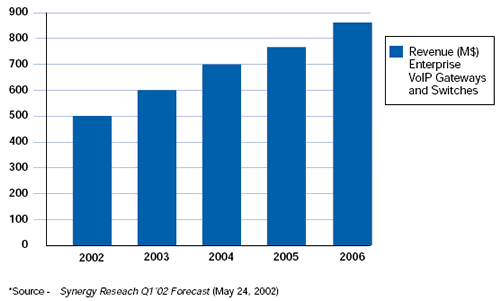 然后, Synergy也預(yù)測(cè)VoIP網(wǎng)關(guān)和交換應(yīng)用從2002年到2006年每年會(huì)有34.6%的增長. 需要產(chǎn)品來把傳統(tǒng)電話交換網(wǎng)絡(luò)和IP網(wǎng)絡(luò)橋接起來.