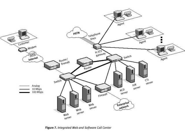 向基于軟件的呼叫中心模型遷移的第一步:通過(guò)使呼叫中心具有Web能力,將來(lái)自因特網(wǎng)的呼叫接入到現(xiàn)有呼叫中心中。圖5展示了H.323網(wǎng)關(guān)如何轉(zhuǎn)換VoIP呼叫到現(xiàn)有自動(dòng)呼叫分配器(ACD)支持的傳統(tǒng)電話呼叫。這一簡(jiǎn)單步驟,使公司能夠通過(guò)基于因特網(wǎng)的電話連接客戶。然而,在客戶所見(jiàn)到的Web頁(yè)面和業(yè)務(wù)代表的Web內(nèi)容及CTI數(shù)據(jù)之間,通常既沒(méi)有邏輯連接,也沒(méi)有物理連接。(CTI數(shù)據(jù)的獲得可能會(huì)通過(guò)在客戶的瀏覽器上下載一個(gè)代理或一個(gè)JAVA小程序?qū)崿F(xiàn),通過(guò)它發(fā)出客戶的位置等相關(guān)數(shù)據(jù))。因此在大多數(shù)情況下,客戶和業(yè)務(wù)代表在購(gòu)買或支持過(guò)程中通過(guò)交談而解決問(wèn)題。